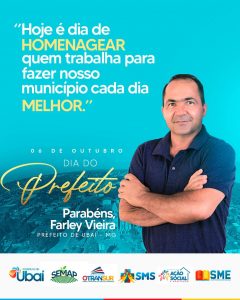 É com muita alegria que parabenizamos o gestor de Ubaí, que junto ao seu fiel parceiro, o Vice-prefeito, Dr. Lázaro Botelho, realiza uma administração que briga incansavelmente por melhorias contínuas e atender ao anseio de todos. Conhece seu povo e seus interesses, cumpre com responsabilidade e compromisso seu papel de representante do povo.