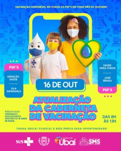Atenção ao Cronograma para a Atualização de Caderneta de Vacinação, dia 16 de outubro, nos PSF’s Geração Saúde, José Braga, Saúde Para Todos e Vila Esperança.