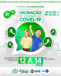A Prefeitura Municipal de Ubaí através da Secretaria Municipal de Saúde, realizará no próximo dia 07 (quinta-feira), em frente ao PSF Geração Saúde, o Dia D de Vacinação para a faixa etária de 12 a 14 anos (sem comorbidades).