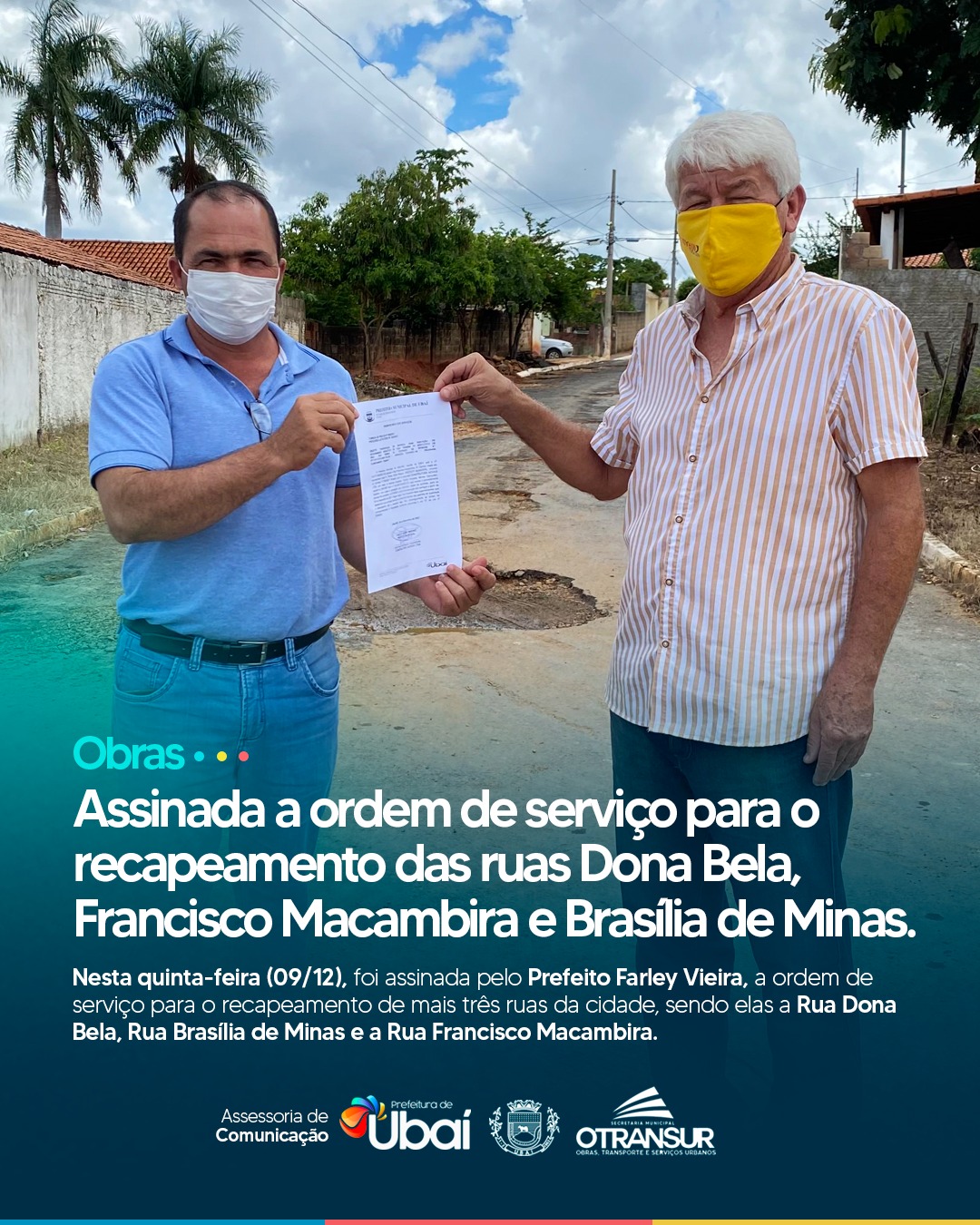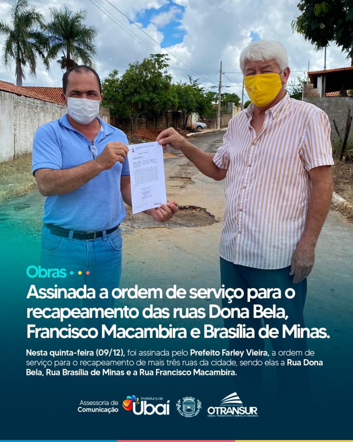 Foi assinada hoje (09/12), pelo Prefeito Farley Vieira, a ordem de serviço para o recapeamento asfáltico das Ruas Dona Bela, Brasília de Minas e Francisco Macambira, no centro da cidade.