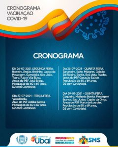 EventosMídiaNotíciasSaúde e Vigilância Sanitária Cronograma de Vacinação contra a Covid-19 na Área Rural, de 26 a 29 de Julho 24 de agosto de 2021 Compartilhar no Facebook Tweet no Twitter Confira o Cronograma de Vacinação contra a Covid-19 na Área Rural, de 26 a 29 de Julho.