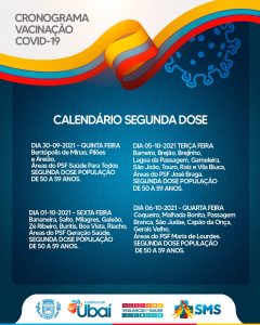 EventosMídiaNotíciasSaúde e Vigilância Sanitária Cronograma de Vacinação contra a Covid-19 22 de novembro de 2021 Compartilhar no Facebook Tweet no Twitter Confira o Cronograma de Vacinação contra a Covid-19 na Área Rural, de 30 de Setembro a 06 de Outubro.