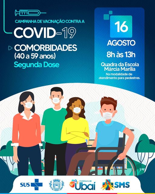 EventosMídiaNotíciasSaúde e Vigilância Sanitária Dia “D” de vacinação contra o covid-19 25 de agosto de 2021 Compartilhar no Facebook Tweet no Twitter Dia D de Vacinação contra a Covid-19: COMORBIDADES 40 A 59 ANOS. 2ª Dose; 16 de Agosto; Quadra da Escola Municipal Márcia Marília (Modalidade de atendimento para Pedestres); 8h às 13h; Portar CPF, Cartão SUS e Cartão Vacina.