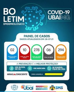 Boletins COVIDCOVID Informe Epidemiológico 28-07-2021 25 de agosto de 2021 Compartilhar no Facebook Tweet no Twitter Atualização de Informe Epidemiológico 28-07-2021. 02 casos suspeito testaram POSITIVO para COVID-19. 06 casos CONFIRMADOS passam para RECUPERADOS. Dados fornecidos pela Secretaria Municipal de Saúde e Vigilância em Saúde Continue seguindo as normas sanitárias. A PREVENÇÃO é a MELHOR PROTEÇÃO! #saude #coronavirus #smsubai #vigilanciaemsaude #prefeituradeubai.