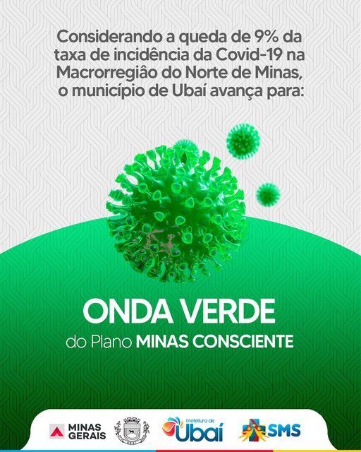 Atualização de onda do Plano Minas Consciente: O Norte de Minas teve queda de 9% nos indicadores da Covid-19, com isso todos os municípios da Macrorregião Norte, incluindo Ubaí, avançam para a Onda Verde do Plano.